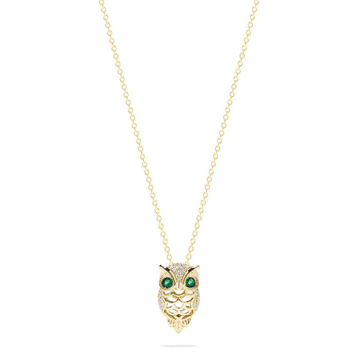 #611 - 14kt Yellow Gold, EFFY, Emerald & Diamond Owl Pendant Chain. 16-18”